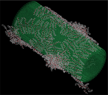 | With access to Ohio Supercomputer Center systems, a research team led by University of Akron's Sadhan Jana simulated organic tie-molecules on the surface of multi-walled carbon nanotubes. The red balls represent oxygen, white balls represent hydrogen and gray balls represent carbon atoms in tie molecules. |