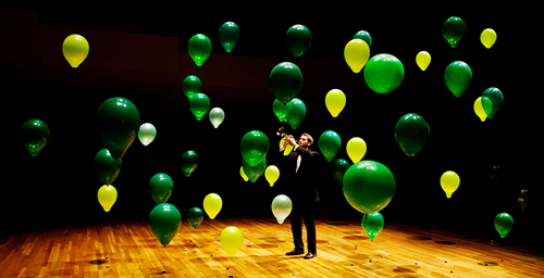 An illustration of Anderson localization. The green balloons represent disordered barriers that localize the sound of the trumpet at its source. |