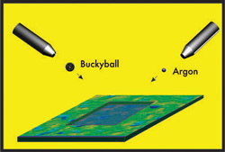 Garrison and her colleagues decided to use computer modeling to test the effectiveness of an alternative approach that another research group had been using. The other group had used not only large, high-energy buckyballs to bombard a surface, but also another smaller, low-energy chemical element—argon—in the process. "In our computer simulations, we modeled the bombardment of surfaces first with high-energy buckyballs and then later, with low-energy argon atoms," Garrison said.