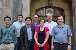 | From left, Liang-shi Li, Steven Tait, Dongwhan Lee, Amar Flood, Sara Skrabalak, David Bish and David Baxter. Not pictured, Lyudmila Bronstein. |