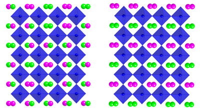 | Manganite oxide lattices (purple) doped with lanthanum (magenta) and strontium (green) have potential for use in spintronic memory devices, but their usual disorderly arrangement (left) makes it difficult to explore their properties. The ANL/NIST team's use of a novel orderly lattice (right) allowed them to measure some of the material's fundamental characteristics. Credit: Argonne National Laboratory |