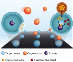 | The ultra small nanoreactors have walls made of lipids. During their fusion events volumes of one billionth of a billionth of a liter were transferred between nanoreactors allowing their cargos to mix and react chemically. We typically carried out a million of individual chemical reactions per cm2 in not more than a few minutes. |