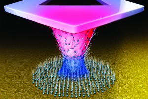 | Thermal dip-pen nanolithography turns the tip of a scanning probe microscope into a tiny soldering iron that can be used to draw chemical patterns as small as 20 nanometers on surfaces. (Image courtesy of DeYoreo, et. al) |