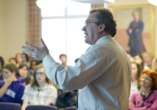 | In a lecture last week, Murray Gibson, founding dean of the College of Science, examined the history of nanoscience — and what studying nature means for its future. Photo by Mary Knox Merrill. |