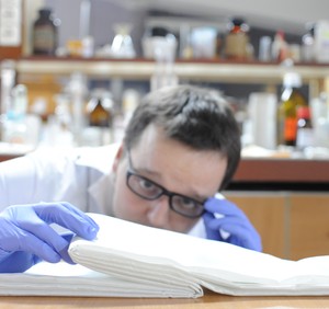 | Jan Paczesny, a PhD student from the Institute of Physical Chemistry of the Polish Academy of Sciences in Warsaw, presents the roll-over mechanism of liquid crystal layers on the water surface that is responsible for formation of the 9-layer film. (Source: IPC PAS, Grzegorz Krzyżewski) |