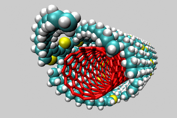 According to Galli, the model provides "a theoretical explanation of how this polymer actually interacts with the nanotube." The polymer has a long, rigid backbone, with regular arm-like molecular chains along each side. The side chains fit together like fingers, making a ribbon of polymer that wraps around the semiconducting nanotubes.