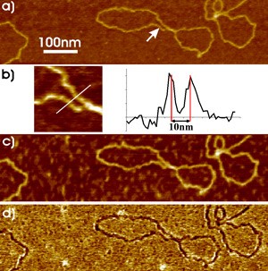 He also commented on some of the reasons for choosing to work with JPK NanoWizard® II for this work: "We are able to use a relatively large size of samples and scan areas of up to 30 microns. The linearized scanner is most important for us to precisely measure the height of DNA and their cross sections. The system shows little thermal drift which is important when making measurements on such small length scales. I also found the software was quite easy to use."