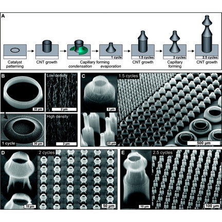 | Figure CNT microstructures: Fabrication of cylindrical CNT microbellows by iteration of growth and capillary forming: (A) schematic illustration of the iterative process; (B) SEM images of a cylindrical CNT microstructure before and after capillary forming (1 cycle), with close-up images emphasizing the densification of aligned CNTs; (C–E) SEM images of microstructures after consecutive growth, forming, and growth cycles, reaching 2.5 cycles in image E. |