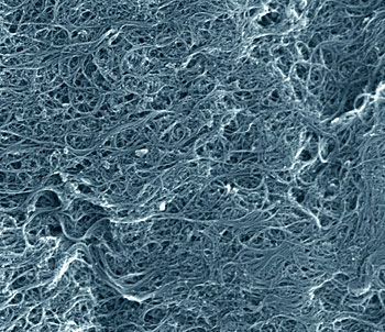 | Scanning electron microscope image of a typical sample of the NIST single-wall carbon nanotube soot standard reference material. The nanotubes tend to stick together and form smaller and larger bundles. Some of the impurities also are visible. The image shows an area just over a micrometer wide. (Color added for clarity.) Credit: Vladar, NIST |