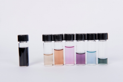 | Armchair-enriched batches of nanotubes show their colors in an array of varying types. The vial at left is a mix of nanotubes straight from the furnace, suspended in liquid. The vials at right show nanotubes after separation through ultracentrifugation. Excitons absorb light in particular frequencies that depend on the diameter of the tube; the mix of colors not absorbed are what the eye sees. (Credit: Erik Hároz/Rice University) |