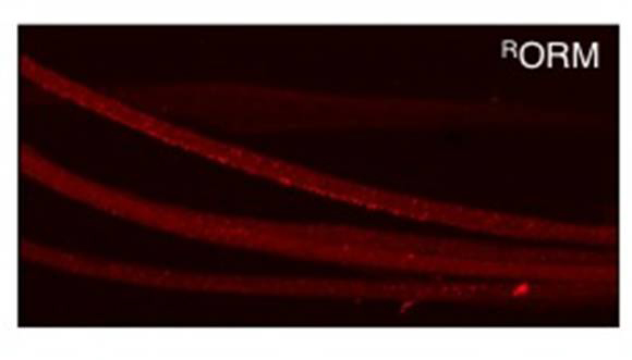 | The bright red spots in this confocal microscopy image are clusters of ORMOSIL particles in axons of fruit fly neurons. Photo courtesy of Shermali Gunawardena and PLoS One. |