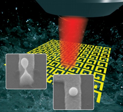 | Similar to the way water backjets eject droplets of water on the surface of a pond, powerful laser pulses can locally melt gold nanostructures and produce gold nanojets, ejecting perfectly spherical gold nanodroplets. |