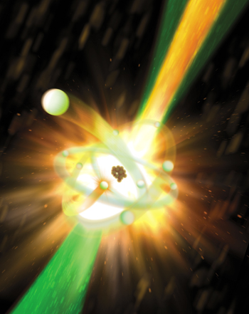 | A powerful X-ray laser pulse from SLAC National Accelerator Laboratory's Linac Coherent Light Source comes up from the lower-left corner (green) and hits a neon atom (center). Illustration by Gregory M. Stewart/SLAC |