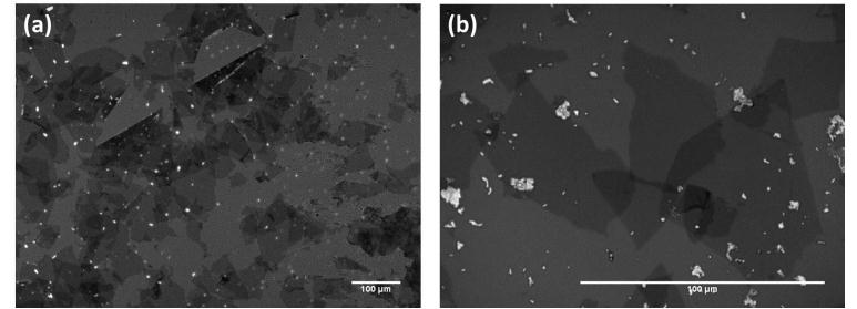 | Image of reduced GO sheets on a SiO2/Si substrate. (a) Optical microscope image; and (b) higher magnification. |
