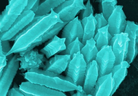 Over 24 hours, the particles plumped up to 550 nanometers long and 55 nanometers wide, many with pointy ends. The particles take on ridges along their lengths; photographed tip-down with an electron microscope, they look like stacks of star-shaped pillows.