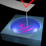 While AFM of soft tissues with a submerged probe is like trying to club fish with a large paddle in a wave pool, the new arrangement is like trolling a fishing line in a calm pond. The nanoneedle displaces very little of the liquid and causes very little drag, yet is very responsive, so that the cantilever can oscillate very gently with very small amplitude.