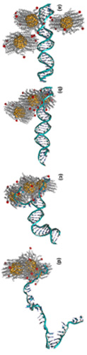 Abstract: The understanding of interactions between double stranded DNA and charged nanoparticles will have a broad bearing on many important applications from drug delivery to DNA-templated metallization. Cationic nanoparticles can bind to DNA, a negatively charged molecule, through a combination of electrostatic attraction, groove binding, and intercalation. Such binding events induce changes in the conformation of a DNA strand. In nature DNA wraps around a cylindrical protein assembly (diameter and height of 6 nm ) with a ~220 positive charge , creating the complex known as chromatin. The charge of a nanoparticle plays a crucial role in its ability to induce DNA structural changes. If a nanoparticle has a highly positive surface charge density, the DNA is likely to wrap and bend upon binding to the nanoparticle (as in the case of chromatin). On the other hand, if a nanoparticle is weakly charged it will not induce dsDNA compaction. Consequently, there is a transition zone from extended to compact DNA conformations which depends on chemical nature of the nanoparticle and occurs for polycations with charges between 5 and 10. While the interactions between highly charged NP and DNA have been extensively studied, the processes occurring within the transition zone are less explored. In this paper, we investigate DNA interactions with weakly charged, ligand functionalized gold nanoparticles (AuNP) and show how binding events with these particles affect the structure of dsDNA. Our chosen AuNP has a 1.4 nm diameter gold core and thiolated alkane ligands bearing primary amines for a total charge of +6 per nanoparticle. The +6 charge permits exploration of DNA-NP molecular interactions in the transition zone. In silico observations showed a reversible and groove specific interaction of AuNPs with DNA and demonstrated that even weakly charged NPs could compromise structural integrity of dsDNA. Electrophoretic mobility indicated the existence of a nanoparticle-modified DNA structure either due to separation into single strands or compaction of DNA. Spectral analysis revealed that the structure of dsDNA with AuNPs is not completely denatured as it has a combination of double and single stranded regions. MD simulations showed that lone AuNPs cannot denature even a dsDNA oligomer, whereas high concentrations of AuNPs can bend and separate DNA strands. Specifically, hydrophobic agglomeration of NPs leads to intercalation of alkane moieties between DNA strands, disrupting Watson-Crick base pairing while charged groups hold and bend the DNA strands. By tuning and balancing charge and hydrophobicity one can envision nanoparticles engineered to evoke a specific structural response from DNA.