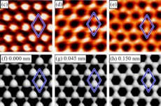 | The top three images of graphite are from the experiment and the lower three images were produced through theoretical calculations. The images from left to right show more displacement of the top layer of graphite and its transition to graphene. |
