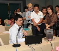 | Rungroj Maolanon (seated) giving a talk on NanoNose technology to private sector groups. |