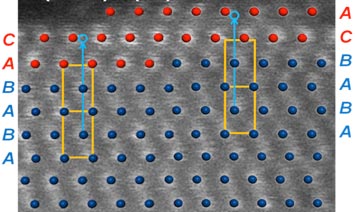 | Click on the image to download a high-resolution version. Computational model optimized with Density Functional Theory superimposed over a high-resolution scanning transmission electron microscopy (STEM) image (white dots). Ruthenium retains its structure with ABAB stacking sequence (blue dots) in the core, and the platinum shell switches to the distinct ABCABC stacking sequence. |