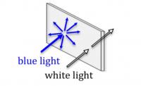 | The basic principle for the new transparent projection screen: nanoparticles that interact with a single color (in this case blue) are incorporated into a transparent material. The result is a material that lets most of the ambient light go through and therefore appears transparent; however, by using a laser projector that sends a blue light beam of the specific color that is scattered by the embedded nanoparticles, one can obtain a high-resolution projected image.