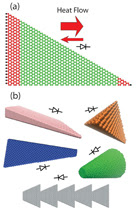 | Researchers are proposing a new technology that controls the flow of heat the way electronic devices control electrical current. Triangular graphene nanoribbons (a) are proposed as a new thermal rectifier, in which the heat flow in one direction is larger than that in the opposite direction. Thermal rectification (b) is not limited to graphene, but can also be seen in other "asymmetric nanostructure materials" including thin films, pyramidal quantum dots, nanocones and triangles. Purdue University image |