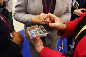 | CEO Elaine Warburton OBE shows QuantuMDx's first prototype disposable handheld malaria diagnostic and drug resistance lab to Maire Geoghegan-Quinn, EU Commissioner for Research, Innovation & Science at the EU Innovation Conference ©EC/CE |