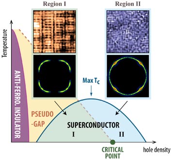 | Disappearing stripes linked with free electron movement: Scientists used a precision microscope to simultaneously explore electrons' arrangements and movements as charge carriers called holes were added to transform a copper-oxide material from an insulator to a superconductor. With increasing hole density, the material first takes on a mysterious "pseudogap" phase that overlaps and competes with superconductivity. Region I: While still in the pseudogap phase, some electrons occupy static positions apparent as a striped pattern (top inset) while other electrons are free to move and carry current, but only in certain directions (arcs with gaps in lower inset). Region II: At a critical point of hole density, the static stripes disappear and all electrons can move freely in all directions. The point of maximal superconductivity (Max Tc) lies within this region. Finding ways to prevent the static electron arrangement may be one way to push the Max Tc to a higher temperature more suitable for real-world applications. |