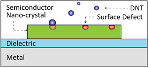 In designing the device, the researchers took advantage of the chemical makeup of many explosives, particularly nitro-compounds such as DNT and its more well-known relative, TNT. Not only do the unstable nitro groups make the chemicals more explosive, they are also characteristically electron deficient, the researchers said. This quality increases the interaction of the molecules with natural surface defects on the semiconductor. The device works by detecting the increased intensity in the light signal that occurs as a result of this interaction.