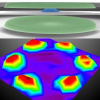| This image spatially maps and visualizes the shapes of multimode Brownian motions. The to of the image is a false-colored scanning electron micrographs of a silicon carbide (SiC) microdisk supported by a central pedestal made of 500nm-thick silicon oxide. The bottom image is a scanned map of vibrations of the microdisk due to a high-order mode Brownian motion.