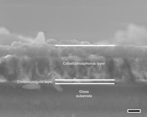 The lab fabricated the 500-nanometer films by anodyzing a cobalt film electrodeposited on a substrate. The assembly was then baked for two hours in a phosphorus vapor that converted it to a cobalt/phosphide/phosphate thin film without damaging its porous structure.