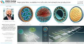The Precision NanoSystems team will be on hand throughout the conference to discuss the practical challenges of nanomedicine development, as well as participating in a number of other activities. In addition, company CEO and co-founder Dr James Taylor will be giving a presentation entitled Meeting the challenge with microfluidics: Enabling nanomedicine development from basic research to the clinic at 14:45 on Monday the 8th in Hall Sidney. Looking at the use of a microfluidic approach for the continuous manufacture of nanomedicines, he will be focusing on some of the new opportunities this technology offers in terms of reproducibility, scalability and the assembly of challenging particle types.