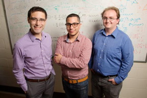 | Inspired by the principles of natural polymer synthesis, Illinois chemical and biomolecular engineering professor Charles Sing, left, and graduate students Jason Madinya and Tyler Lytle co-authored a study that found they could create new synthetic materials by tuning the electrostatic charge of polymer chains. CREDIT Photo by L. Brian Stauffer |