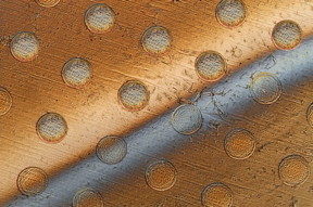 | This photo shows circles on a graphene sheet where the sheet is draped over an array of round posts, creating stresses that will cause these discs to separate from the sheet. The gray bar across the sheet is liquid being used to lift the discs from the surface. Image: Felice Frankel |