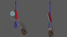 | A nylon fibre (light blue), deposited on the carbon carrier (grey), lifts up the crystal (red). This way, the crystal's side face becomes visible to the electron beam (blue). Without the fibre (right figure), the crystal lies flat on the carbon and the metal bar of the sample holder (marbled) occludes the signal. CREDIT © Tim Grüne |