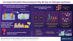 Scientists at Tokyo Institute of Technology (Tokyo Tech) discover a new electrocatalyst for the oxygen evolution reaction (OER) in electrochemical water splitting: CaFe2O4. This inexpensive, non-toxic, and easy-to-synthesize material outperforms other bimetallic OER electrocatalysts and even surpasses the benchmark set by iridium oxide, paving the way to accessible hydrogen generation for upcoming hydrogen societies.