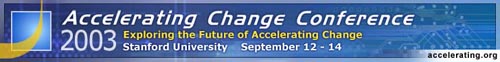 Announcing Accelerating Change Conference (ACC2003): Exploring the Future of Accelerating Change, a forum for 300 participants to explore the paradise of resources, as well as the risks and responsibilities, represented by cascading breakthroughs in computational technologies. Accelerating change is a fact; what to do? Ray Kurzweil (via Teleportec's 3D Telepresence Lectern), K. Eric Drexler, Steve Jurvetson, Tim O'Reilly, Robert Wright, and 18 other speakers to present at Stanford University on September 12 - 14.