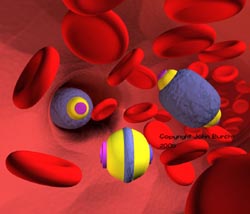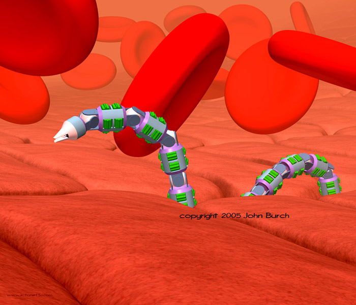 It is rather large and probably travels around by means of the blood supply. Once it is carried into a known tumor, it would begin killing cancer cells by rupturing their cell walls. It also allows a doctor to monitor blood chemicals and general health of the patient.