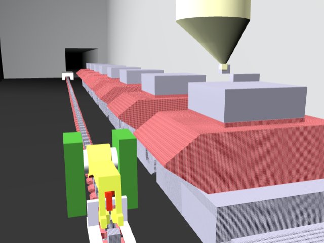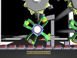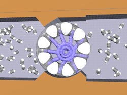View of the smallest stage of the nanofactory. Wheels in upper left purify Acetylene molecules. The gray wheel at upper center presents individual molecules to the bonding tools on the white wheel at center. Hydrogen is stripped from the carbons by the white wheel at lower left, leaving only two carbon molecules. These two atoms are applied to the moving chain mechanism on the right to build small cubes of diamond.