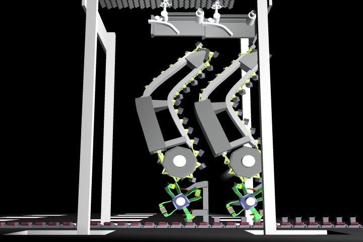 Side view of exturder stage of desktop factory. Fixed machines at the bottom supply new material to the moving mechanism at the top of the cantilever beams where diamond blocks are applied to the surface of a product under construction.