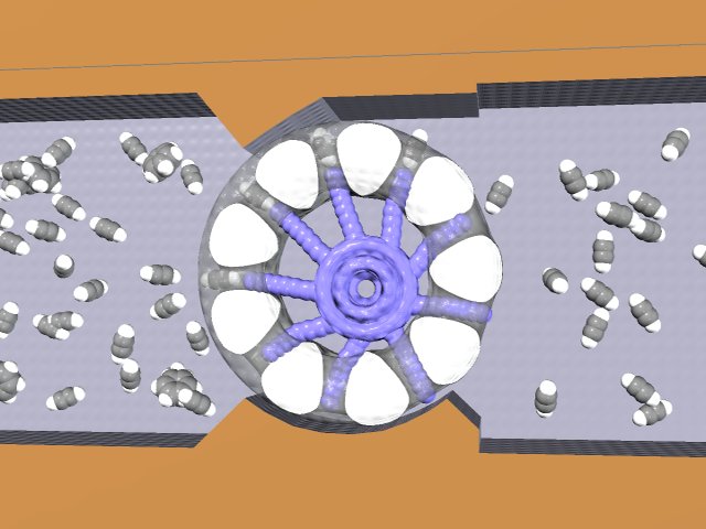 Close view of the purification wheels. The offset blue spider allows molecules to fill temporary holes on the left, inlet side and expels the molecules on the right output side of the wheel.