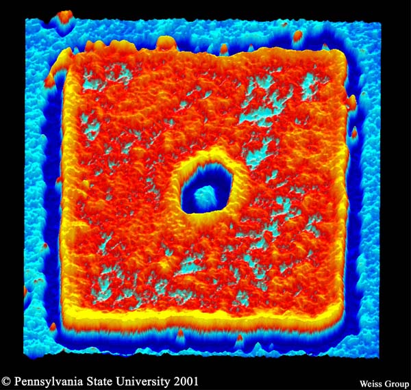 A field emission scanning electron microscopy image showing a ~30 nm gold dot formed in the center of a hollow gold parent structure supported on an oxidized Si substrate. This nanostructure was fabricated by a 'molecular ruler' resist process developed to extend the range of conventional nanolithography techniques. Image by: A. Hatzor & B. A. Mantooth