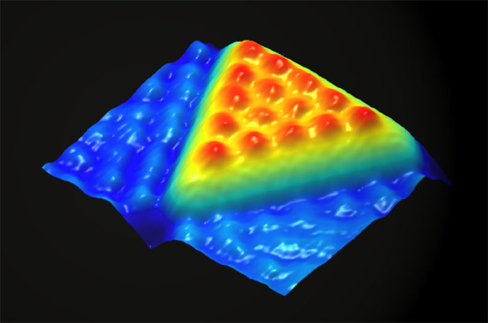Ripples in the electron density of a stepped gold surface taken using scanning tunneling microscopy at 4 Kelvin. The central triangle is a single atom high terrace containing ~ 650 gold atoms. The "billiard balls" are maxima in the electron density at the Fermi level and are caused by constructive interference of the electron waves as they bounce off the edges of the triangular gold box. Quantum mechanics lets us solve the structure using particle in a box equations. We are now investigating how molecules interact with the electron density in these systems. Image by: E. H. Sykes, P. Han, & B. A. Mantooth