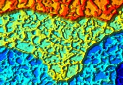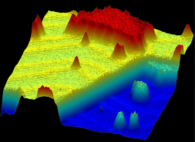 A scanning tunneling microscope image (200nm x 140 nm) of a self-assembled monolayer of n-decanethiolate on Au{111} that has been vapor-annealed in n-dodecanethiolate. The protrusions on each of the atomic steps are the 1.1 Å higher n-dodecanethiolate molecules. Image by: Z. J. Donhauser