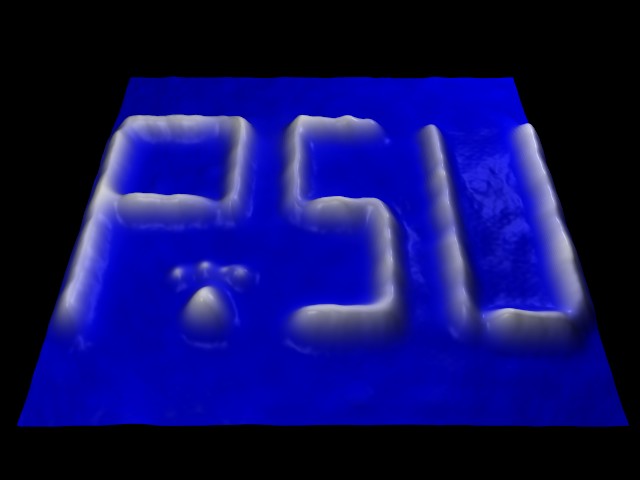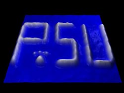 A scanning tunneling microscope image of subsurface hydrogen in palladium at 4 Kelvin. The letters are 0.3 Å high and 40 Å wide, and arise from an outward relaxation of the Pd{111} surface atoms to accommodate hydrogen atoms in the subsurface region. The letters are created by inducing segregation of bulk hydrogen to interstitial sites directly below the surface using voltage pulses applied to the microscope tip. Image by: E. H. Sykes, L. Fernandez, & B. A. Mantooth
