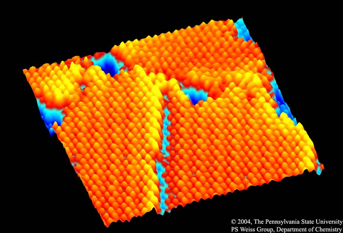 A scanning tunneling microscope image (15 nm x 15 nm) of a self-assembled monolayer of n-decanethiolate on Au{111}. The individual molecules closely pack into a hexagonal array. Features of the assembly and surface, respectively, including domain boundaries (light blue stripe) and gold vacancy islands (circular blue depressions) are easily seen. Image by: R. K. Smith & B. A. Mantooth