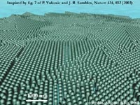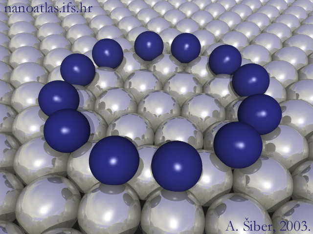 A small coral of atoms (blue, perhaps assembled using the tip of atomic force microscope) on an face-centered-cubic surface. |