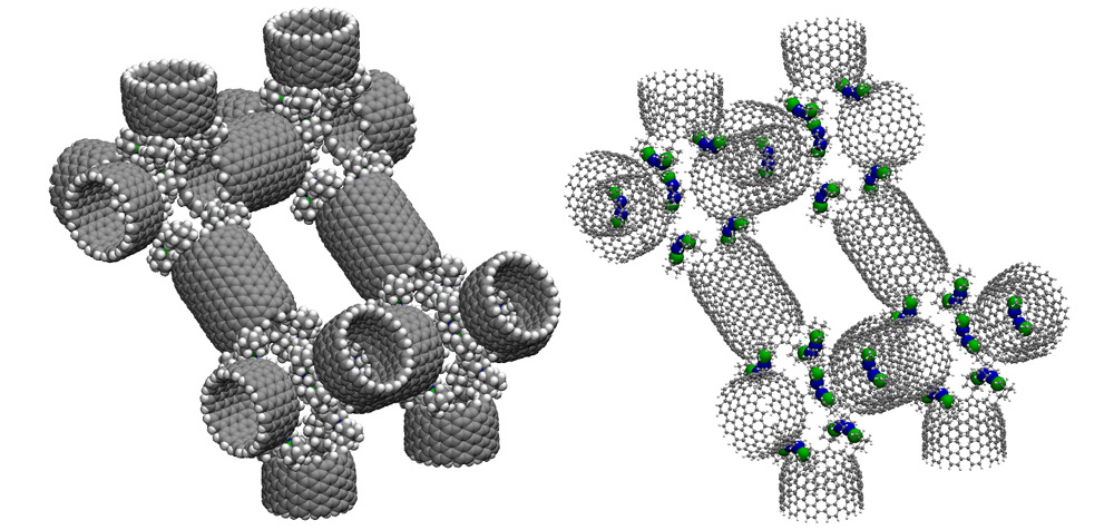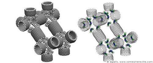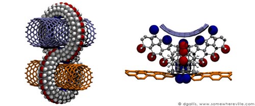 In this design, two rigid diamondoid rings are fused at a quasi-tetrahedral junction and sized, through the addition or subtraction of repeat subunits in each ring, to accommodate two carbon nanotubes of different diameters. The crimping of the nanotubes is a result of van der Waals packing of the rings, a feature that can be enhanced or removed by adjusting the ring size. (grey = carbon, white = hydrogen, blue = nitrogen, red = oxygen) |
