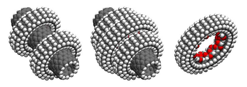 In this design, two diamondoid rings replace small segments of a carbon nanotube, providing a lock for a third, larger ring. The larger ring includes a stitch-work of oxygens to create an electron-rich interior whose effective circular van der Waals packing just touches that of the nanotube framework. |