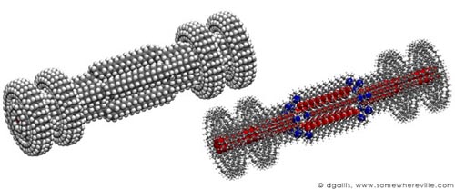 Here, a five-fold rotation axis in a single rigid rod is coupled to four rings composed of 15 subunits each. A pagodanoid junction is included along this rigid rod to raise the five sections of the assembly to create an elevated gearing system. The image at left is a van der Waals representation. At right, only the oxygen and nitrogen atoms are shown (as spheres) to highlight the rod interior. (grey = carbon, white = hydrogen, blue = nitrogen, red = oxygen) |